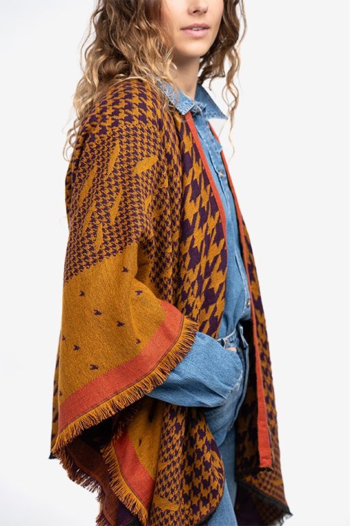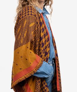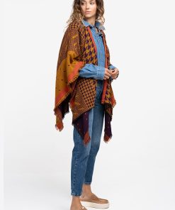 Women’s poncho with houndstooth print that combines different shades of colour. Its fabric has an ultra-soft feel and is very warm, perfect for autumn and winter days. Its frayed ends give it a very casual look. Very combinable and fashionable, it will become an essential for cold days.