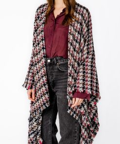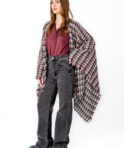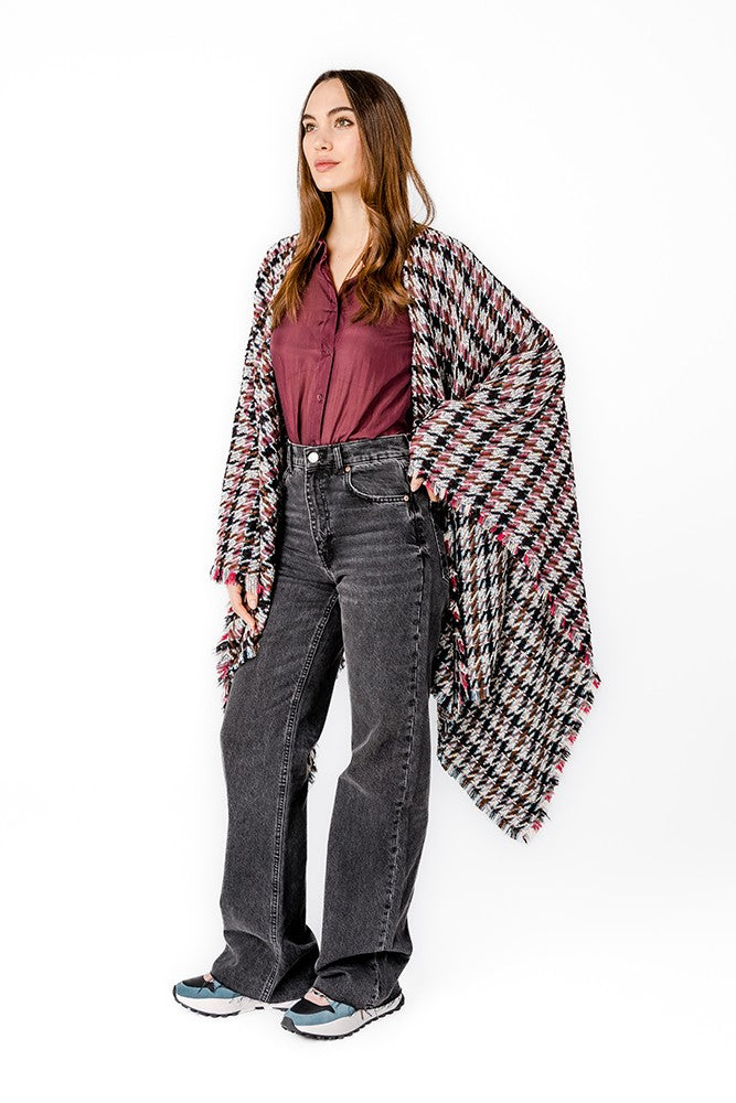 Women’s poncho with houndstooth print, a print in total trend that remains strong season after season. Its fabric has an ultra-soft feel and is very warm, perfect for autumn and winter days. Its ends are frayed, giving it a casual and youthful look. It is the perfect fashion accessory to accompany you in the colder months.