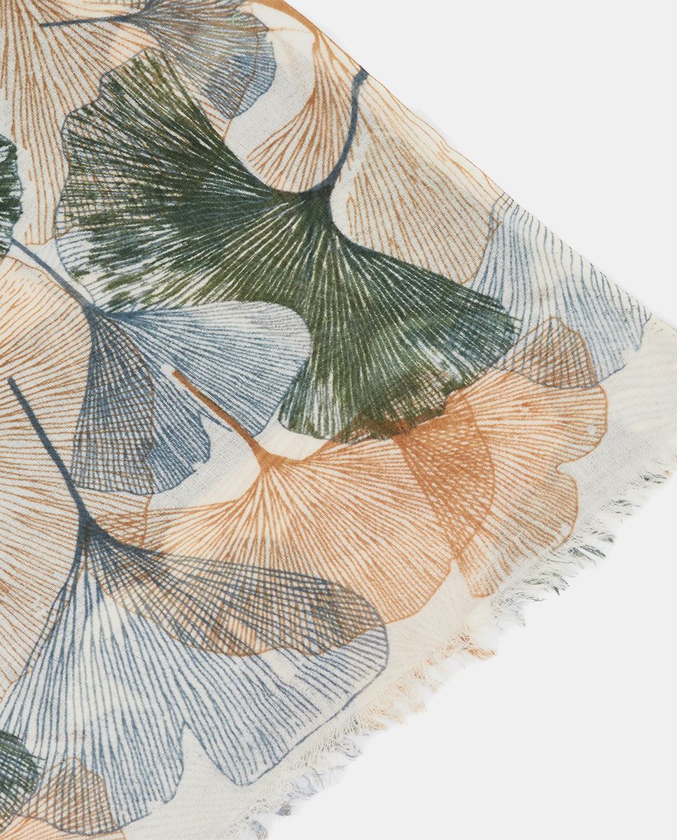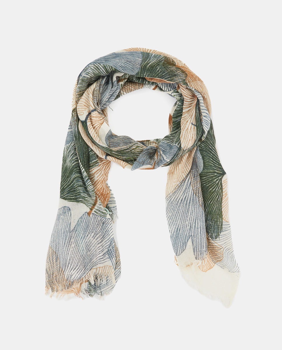 Soft, lightweight wool scarf with a floral print. A versatile and functional accessory, ideal for any occasion. Frayed edges.