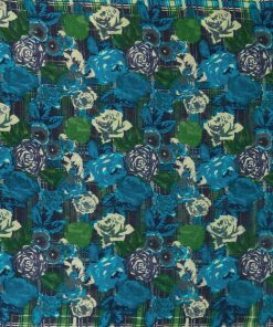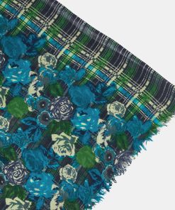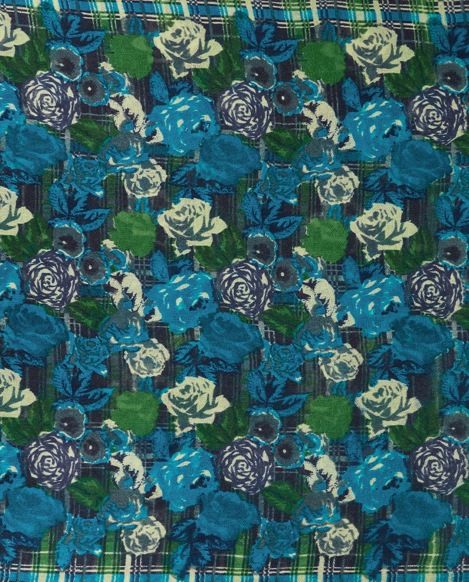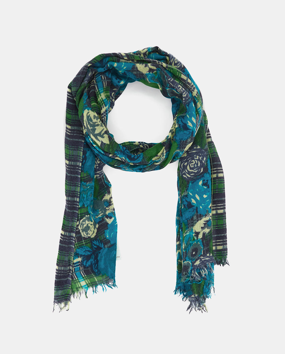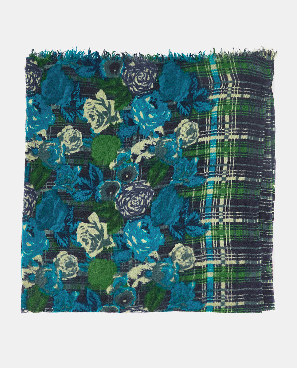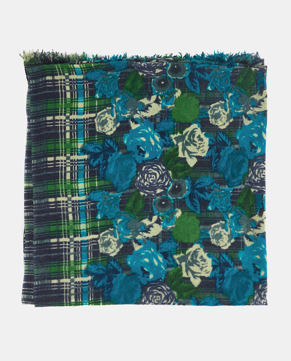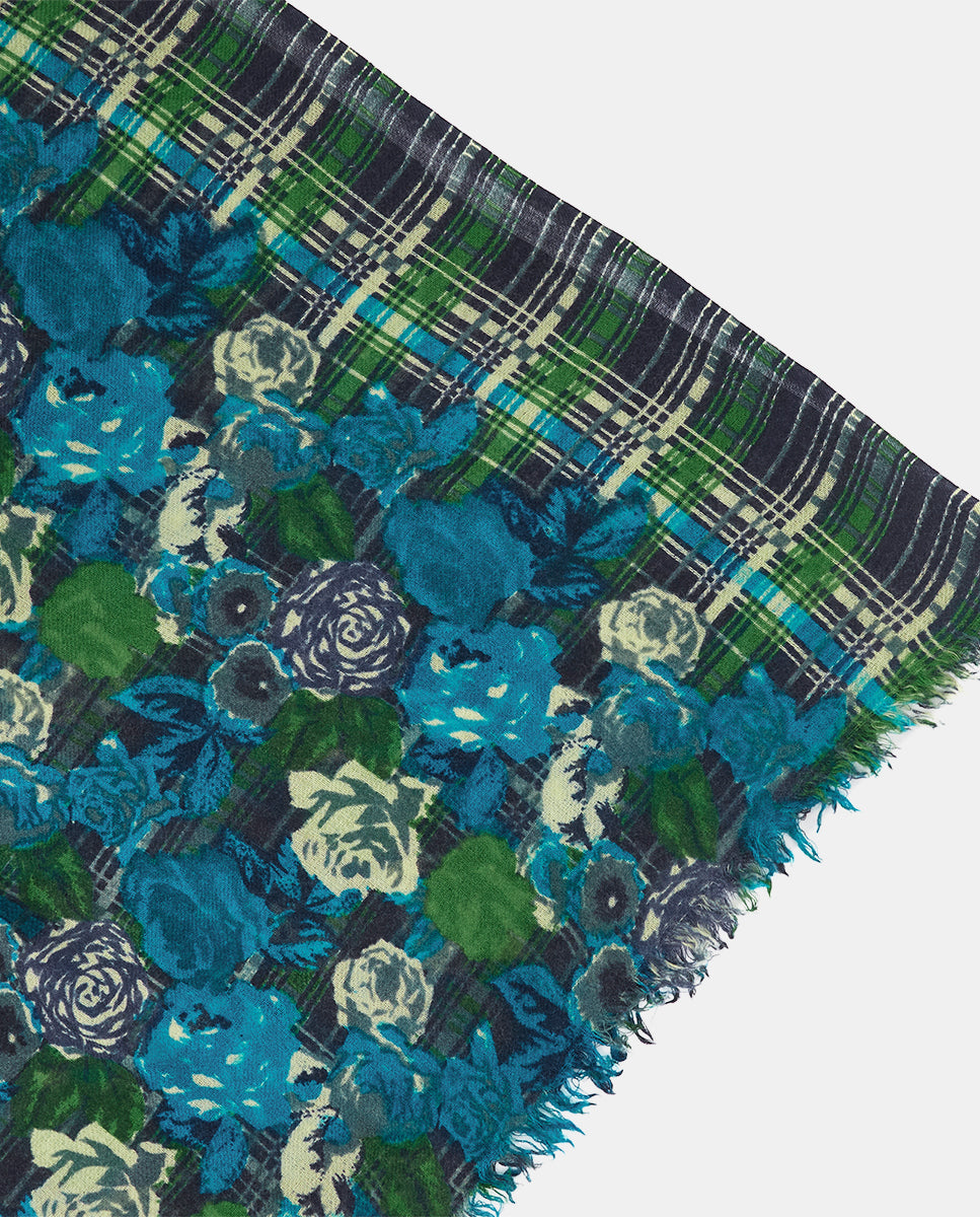 Soft, lightweight wool scarf with a floral and plaid print. A versatile and functional accessory, ideal for any occasion. Frayed edges.