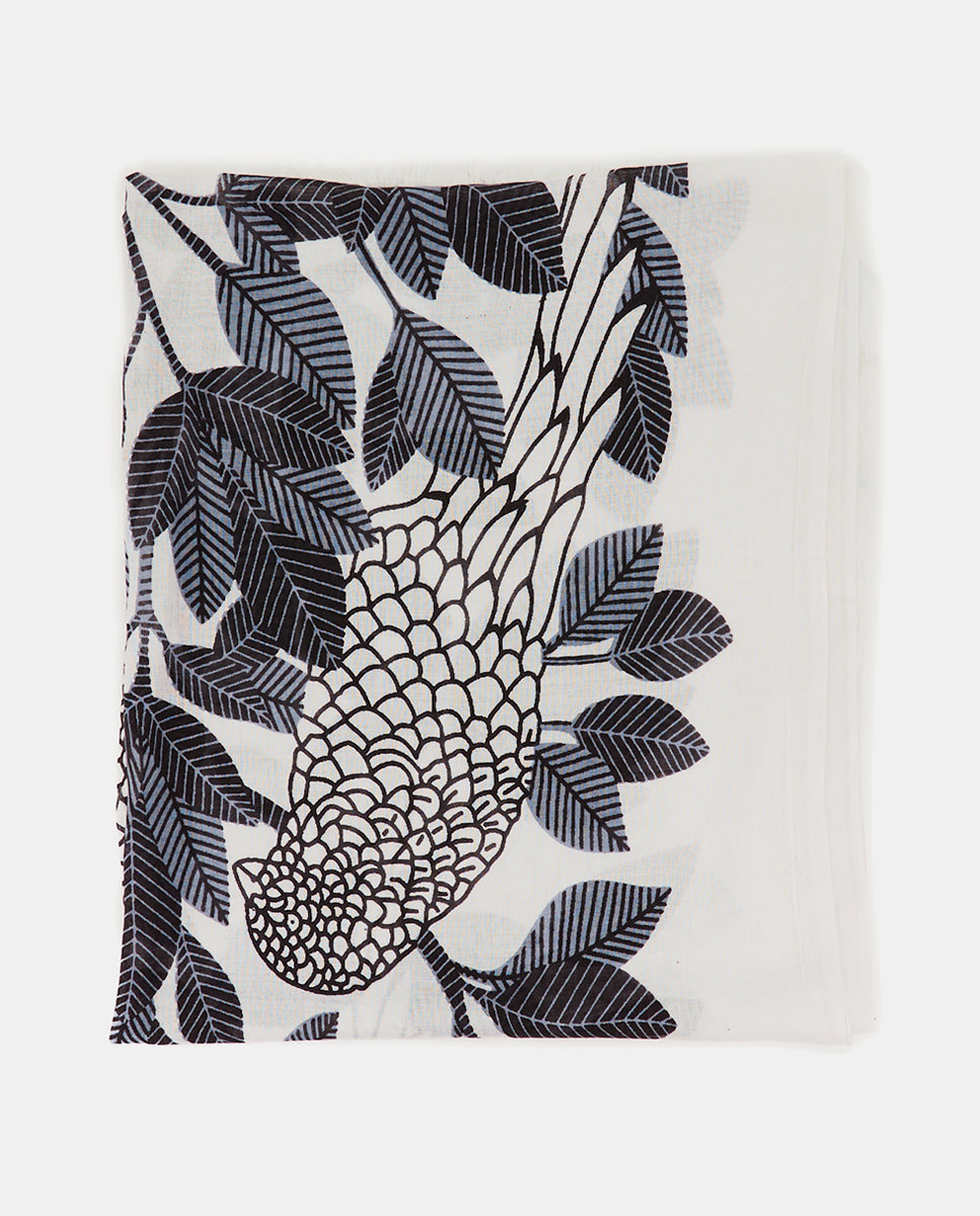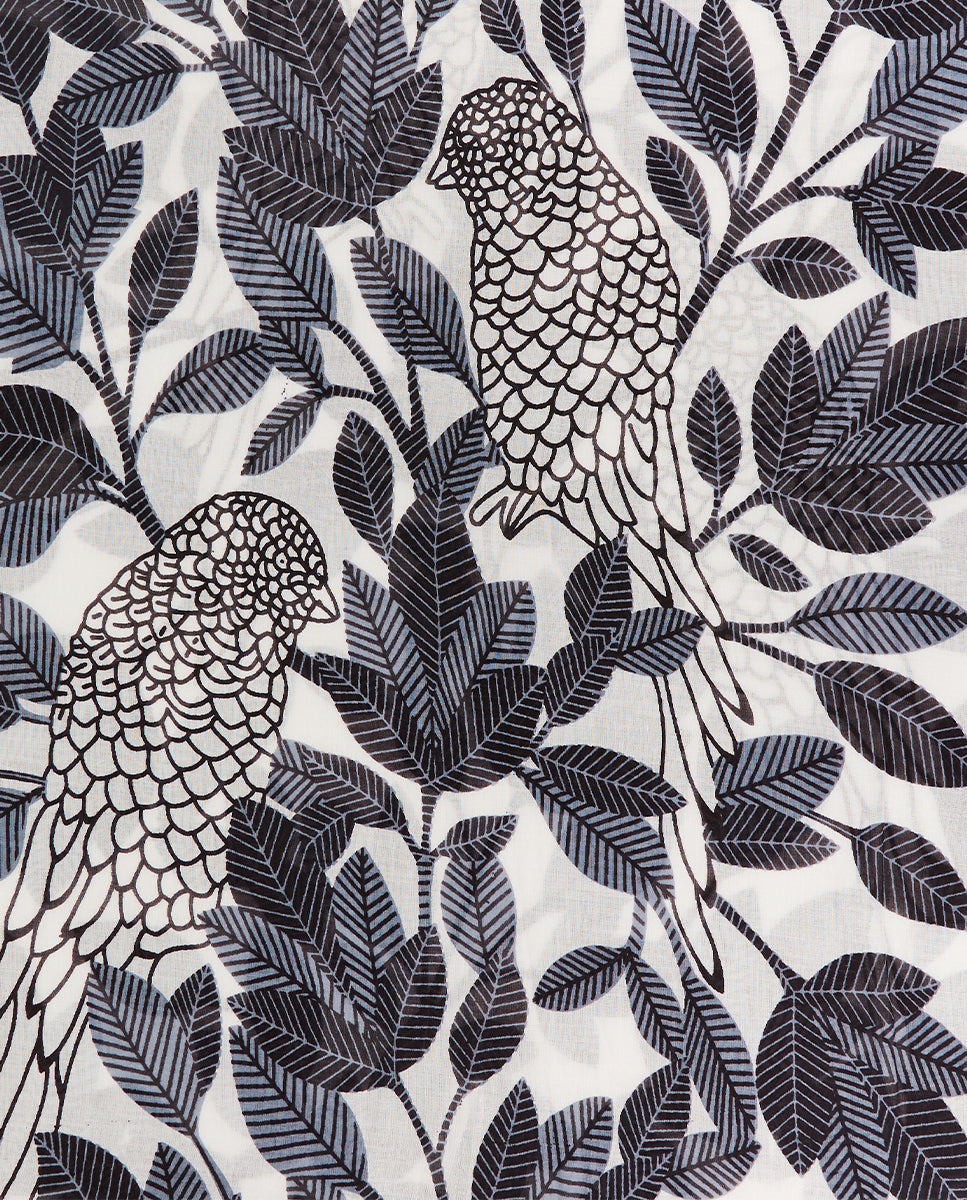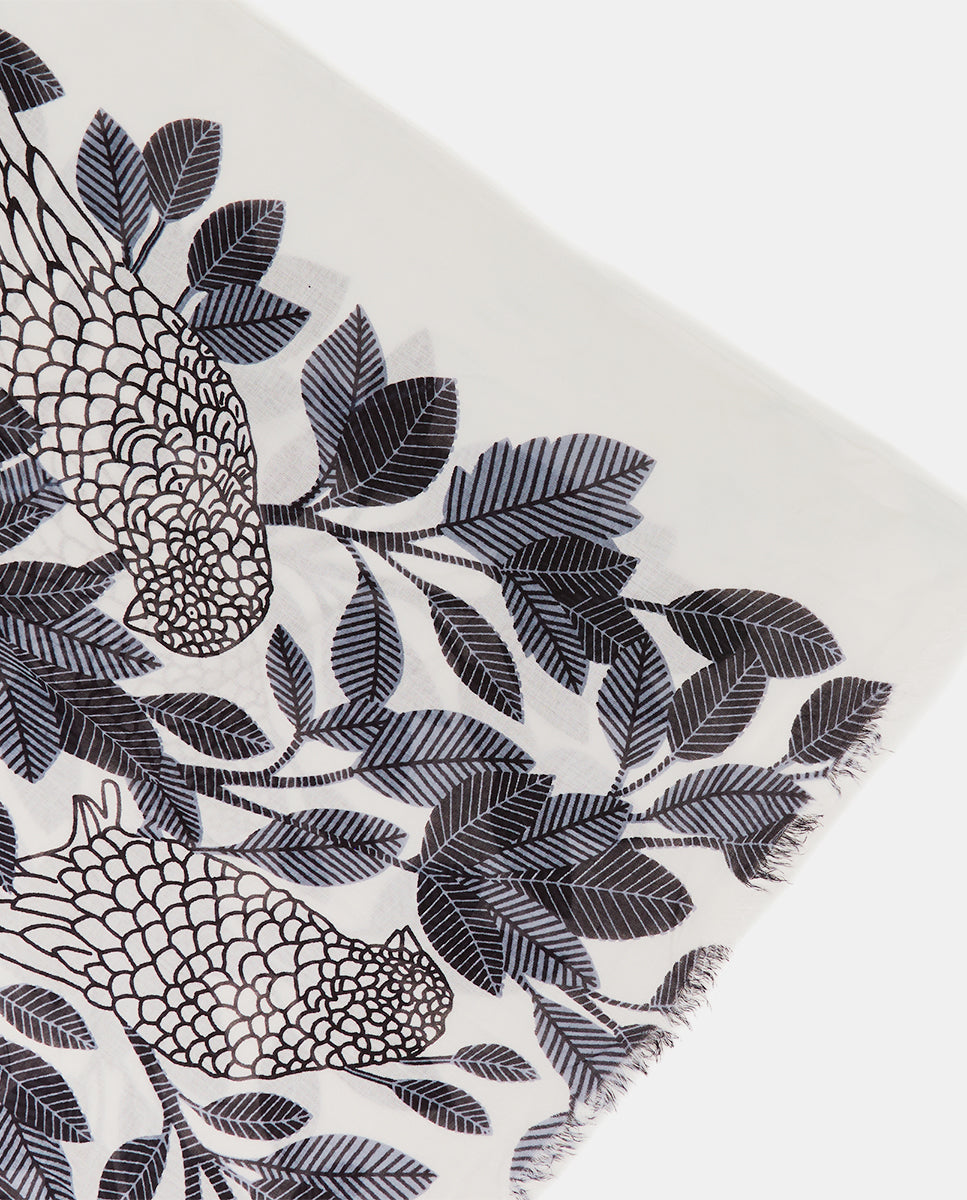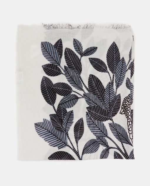 Women’s scarf with a unique natural print made of viscose. This design stands out with its striking print of natural motifs, featuring the impressive silhouette of a central bird. Its soft, fresh, and loose fabric is perfect for the spring and summer months. The frayed edges add a more casual style.