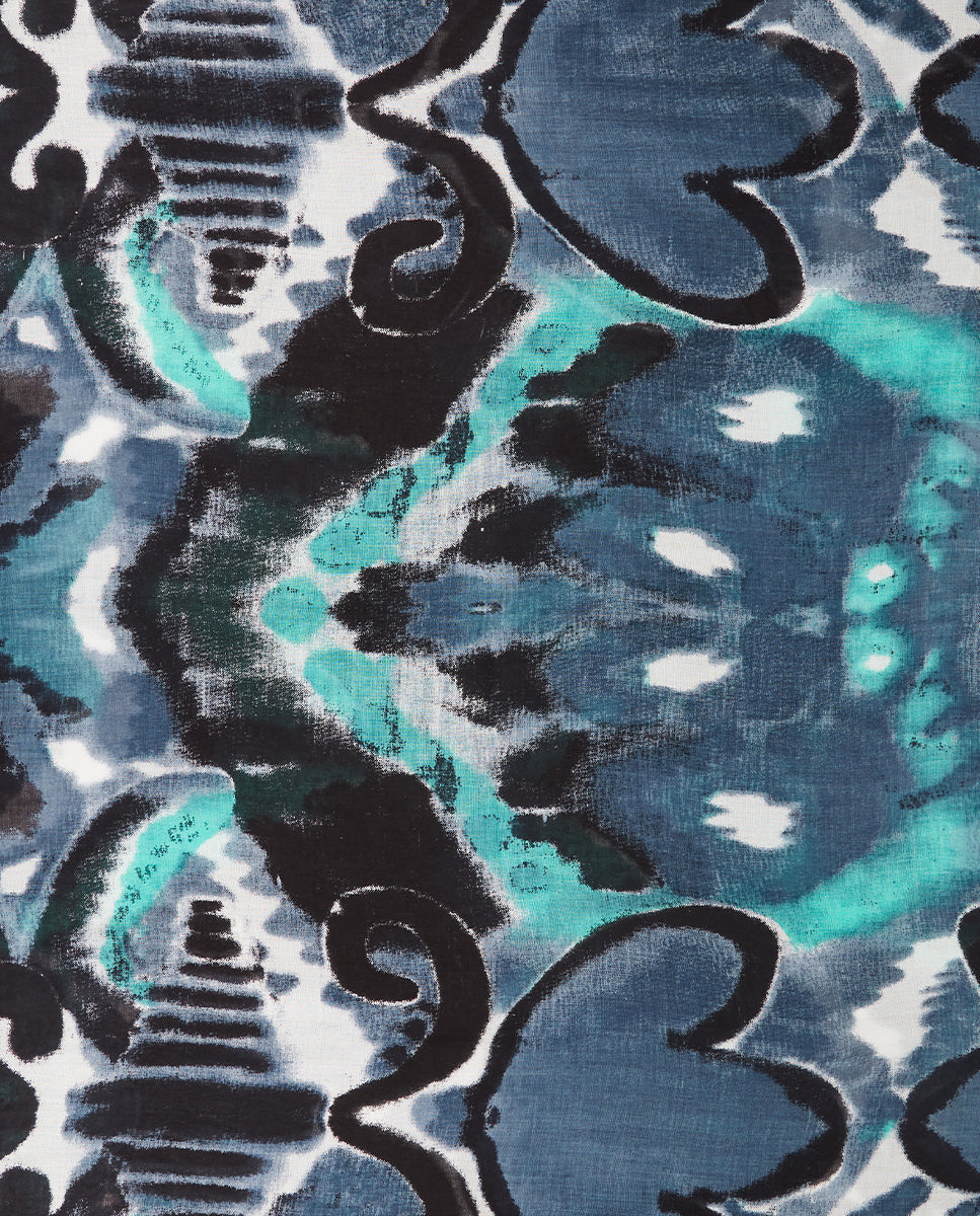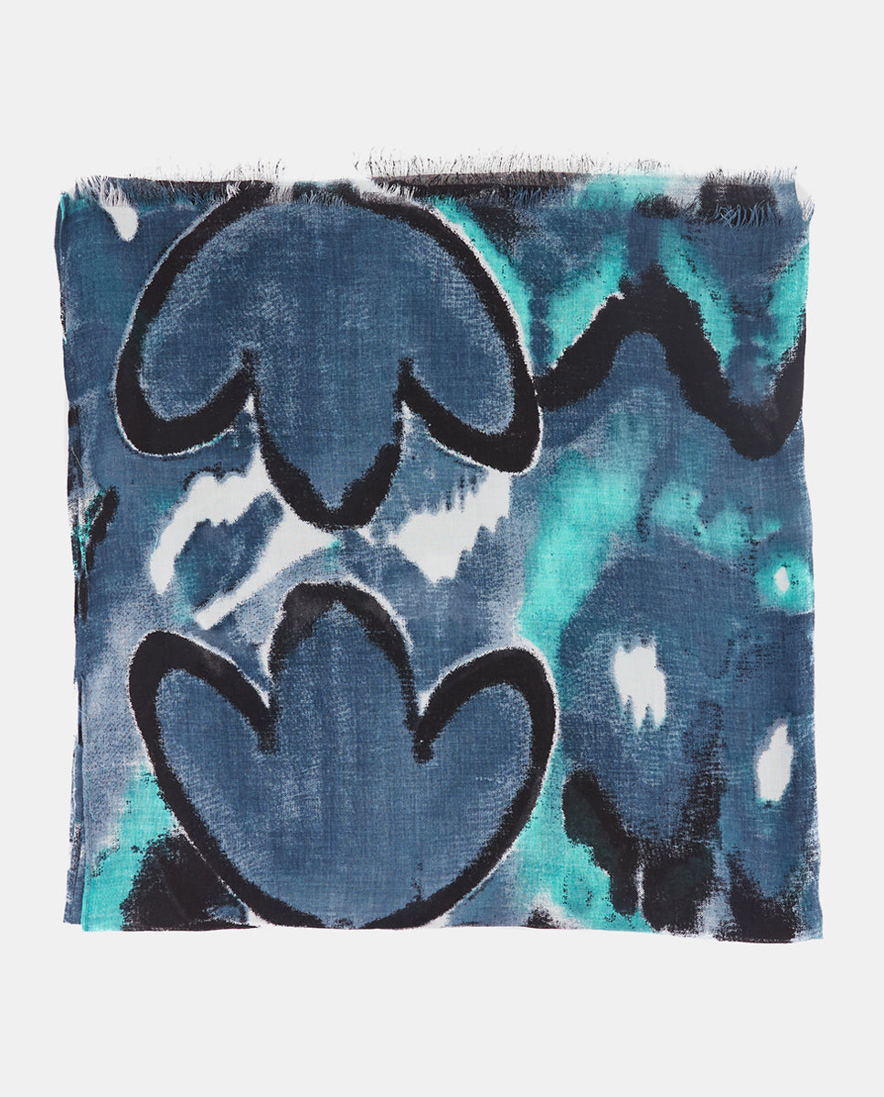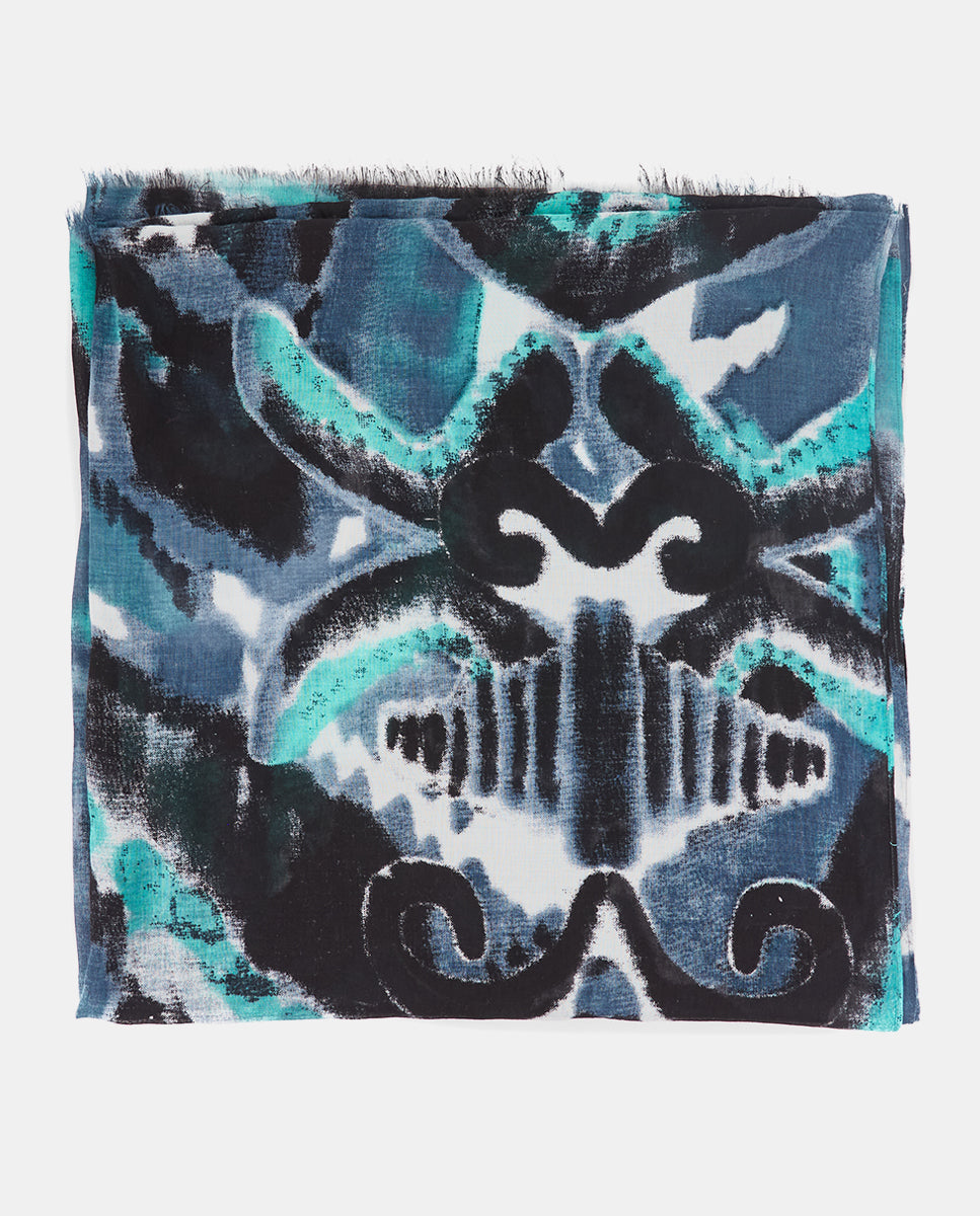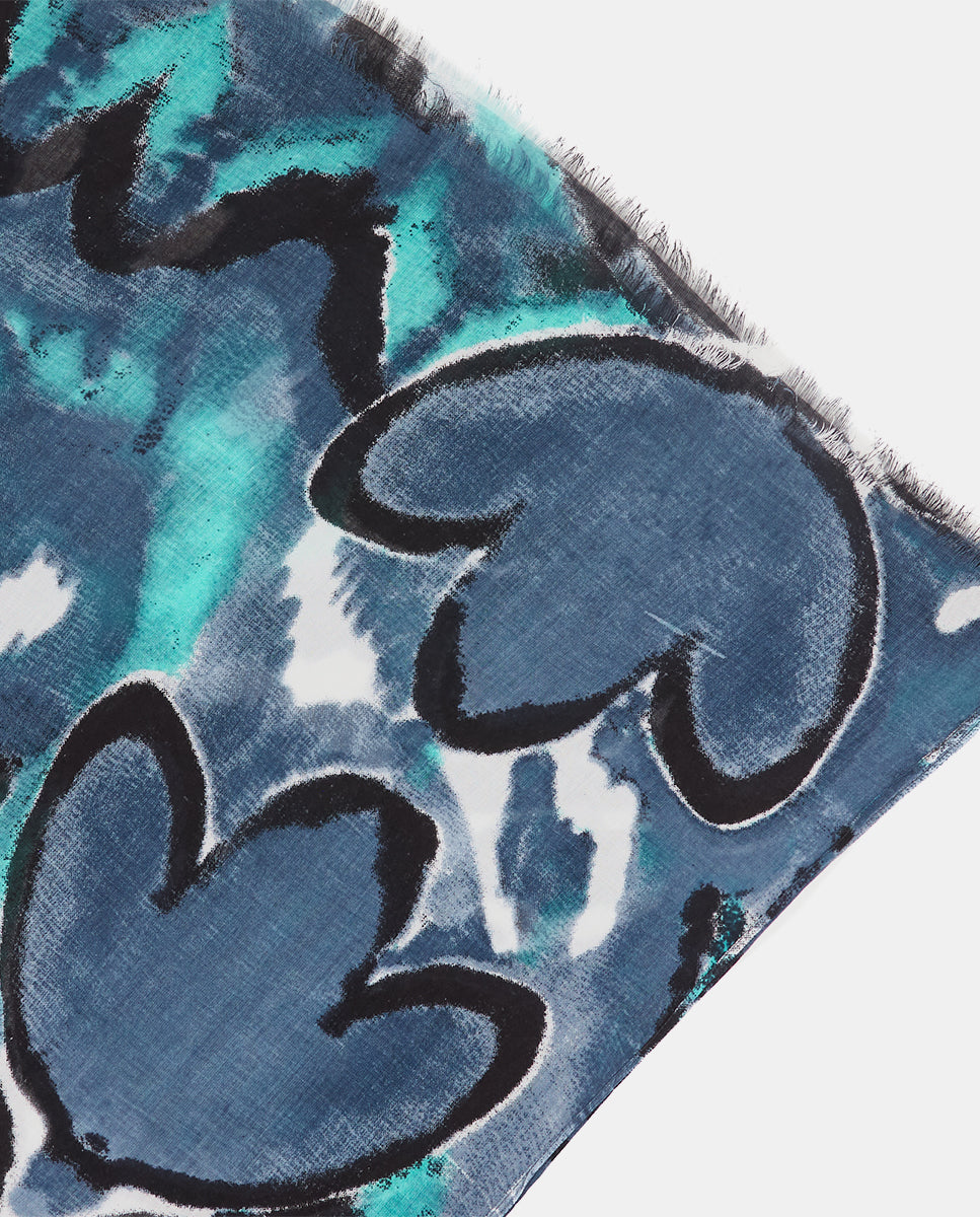 Soft, lightweight wool scarf with an abstract print. A versatile and functional accessory, ideal for any occasion. Frayed edges.