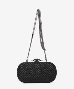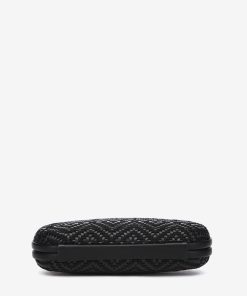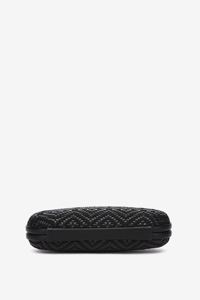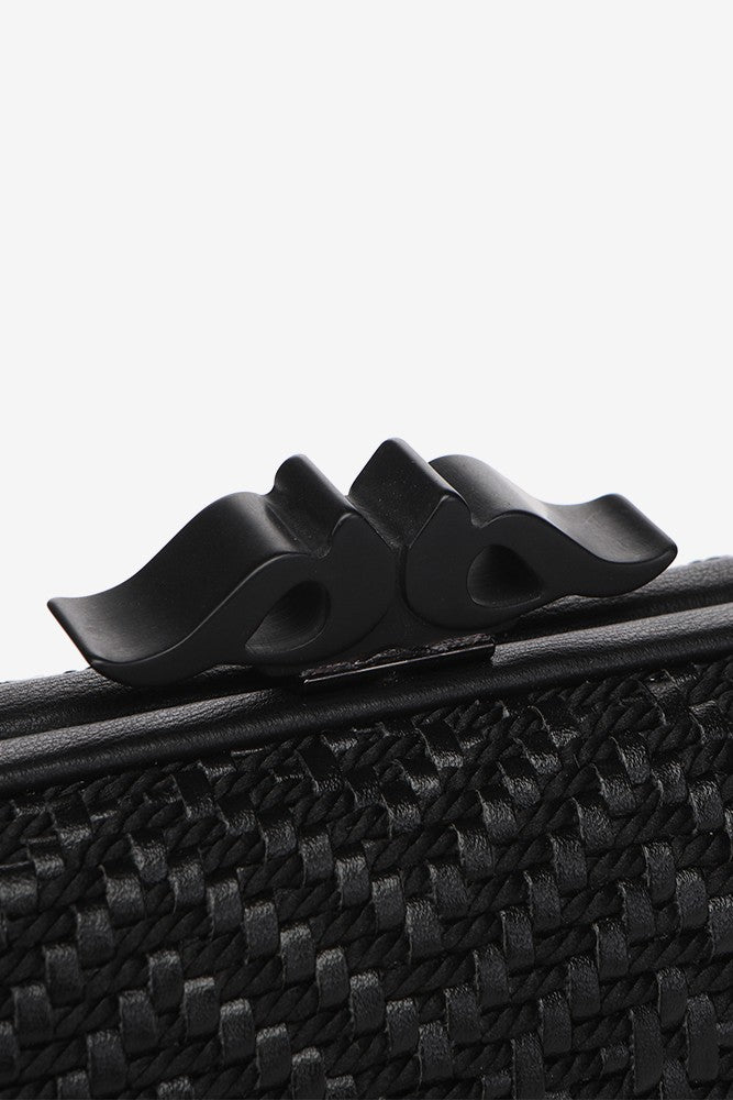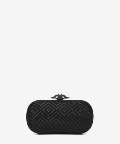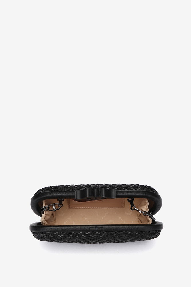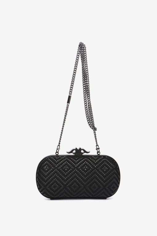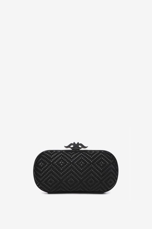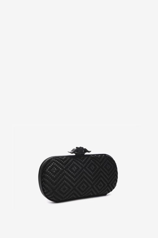 Oval party clutch with geometric print and 3D closure with wooden logo. A special handbag for events in which to carry your essentials. Its main features are: