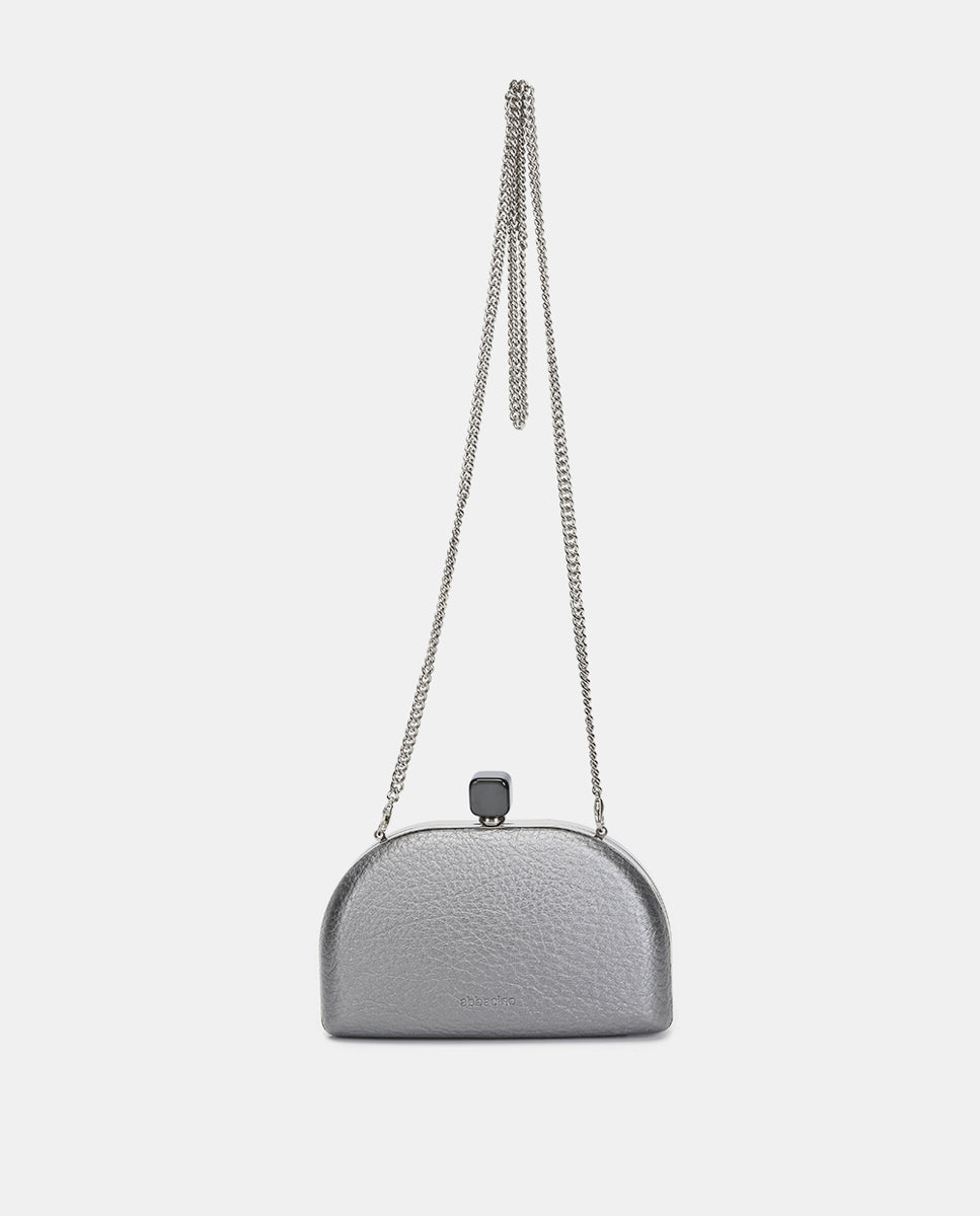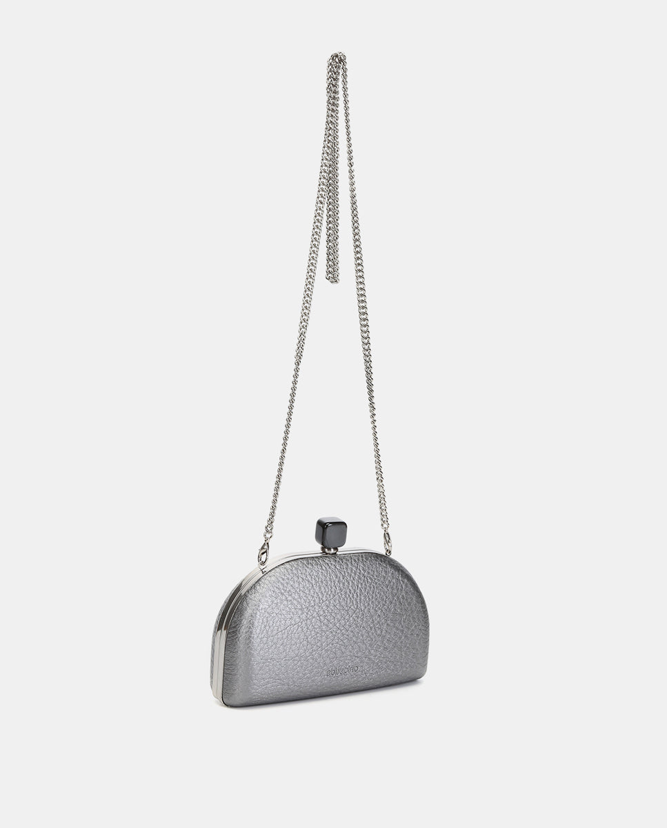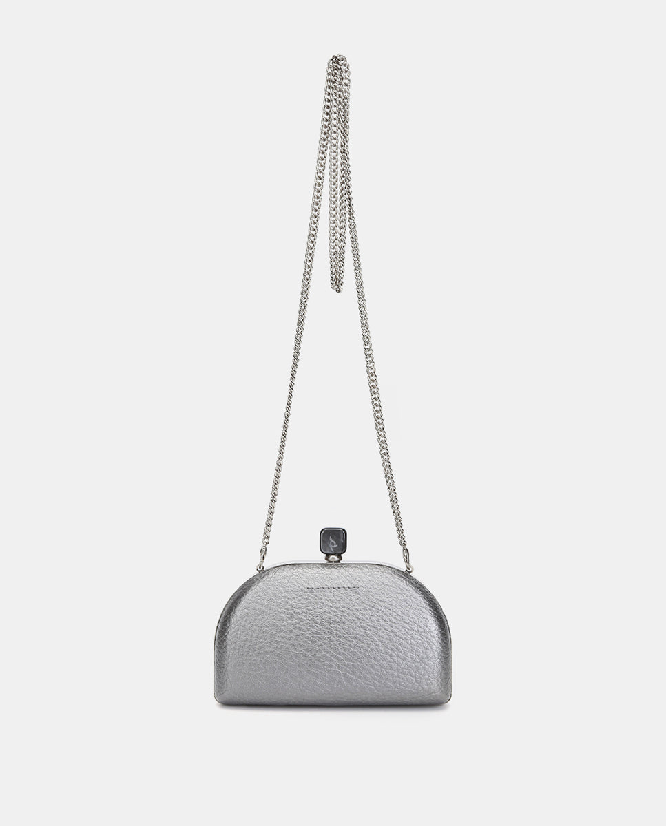 Metallic-finish, half-moon-shaped evening clutch, ideal for special events. Its striking and functional design makes it the perfect accessory for your most sophisticated looks. Its main features are:
