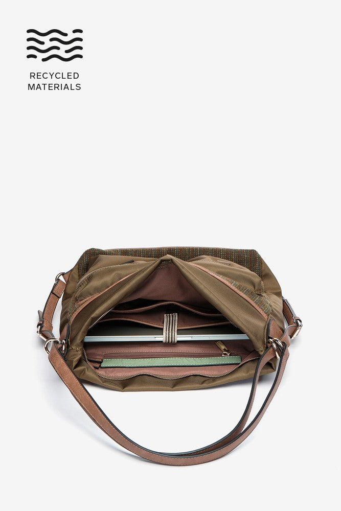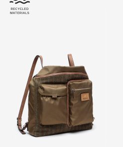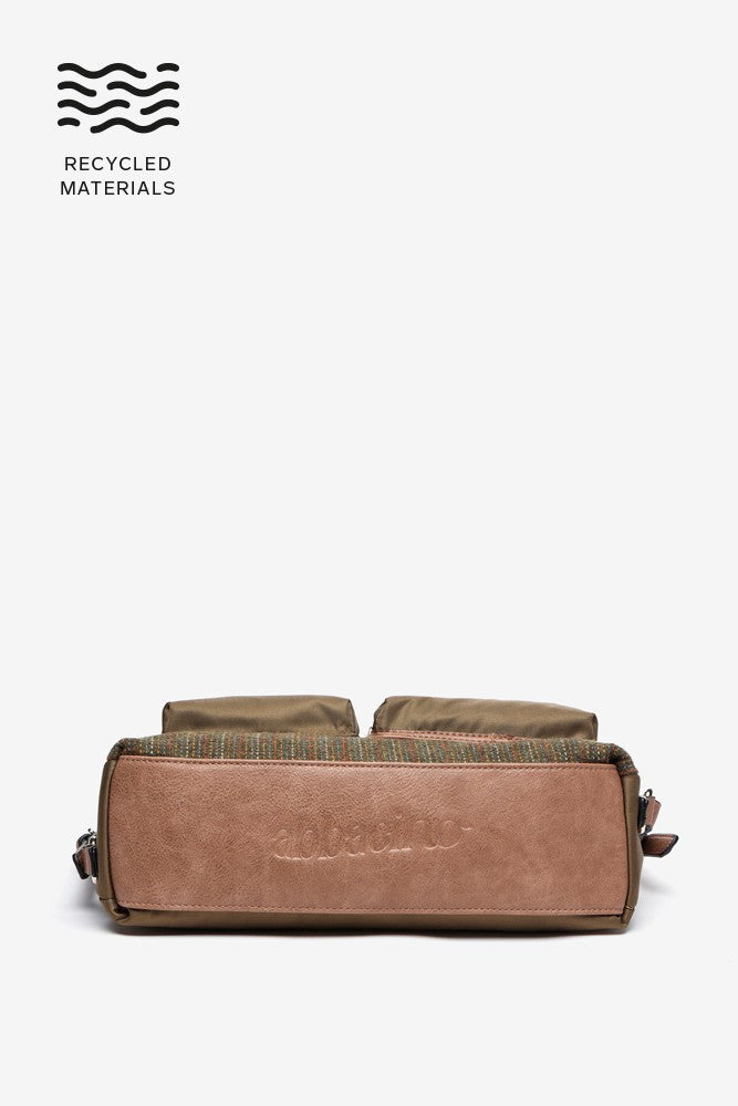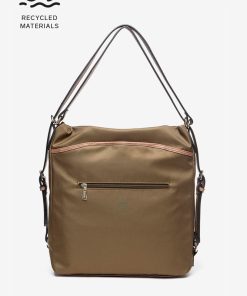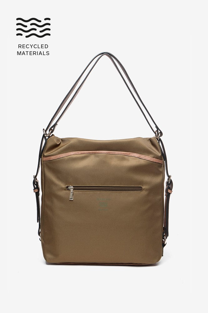 Multi-pocket bag-backpack made from recycled materials, combining two different fabric textures. A very functional design thanks to the various interior and exterior compartments that will allow you to organise and always have your day-to-day essentials at hand.