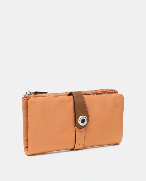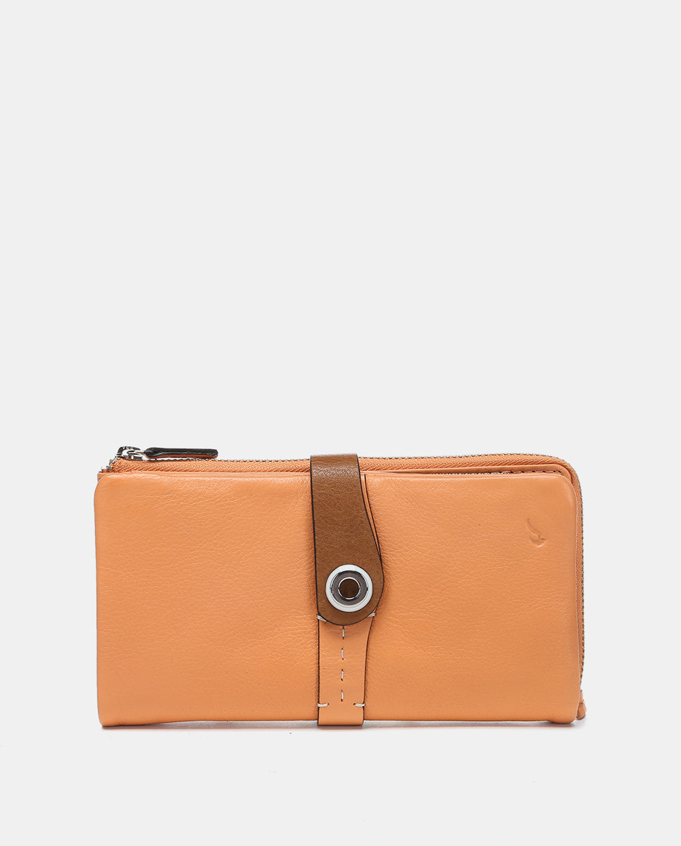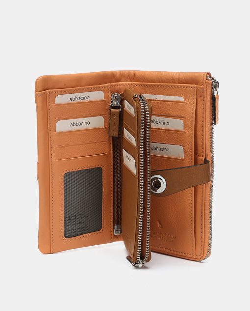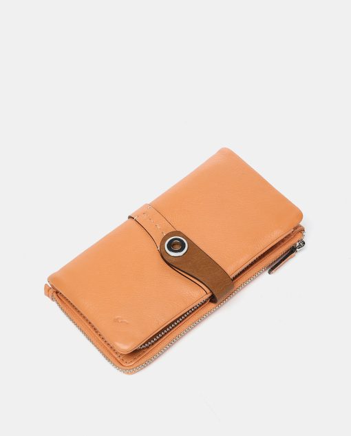 Large women’s wallet made from leather that combines two color tones. A very original model dyed in summery colors with metallic accents. Its main features are: