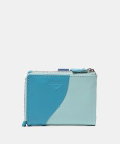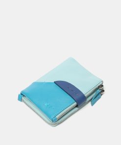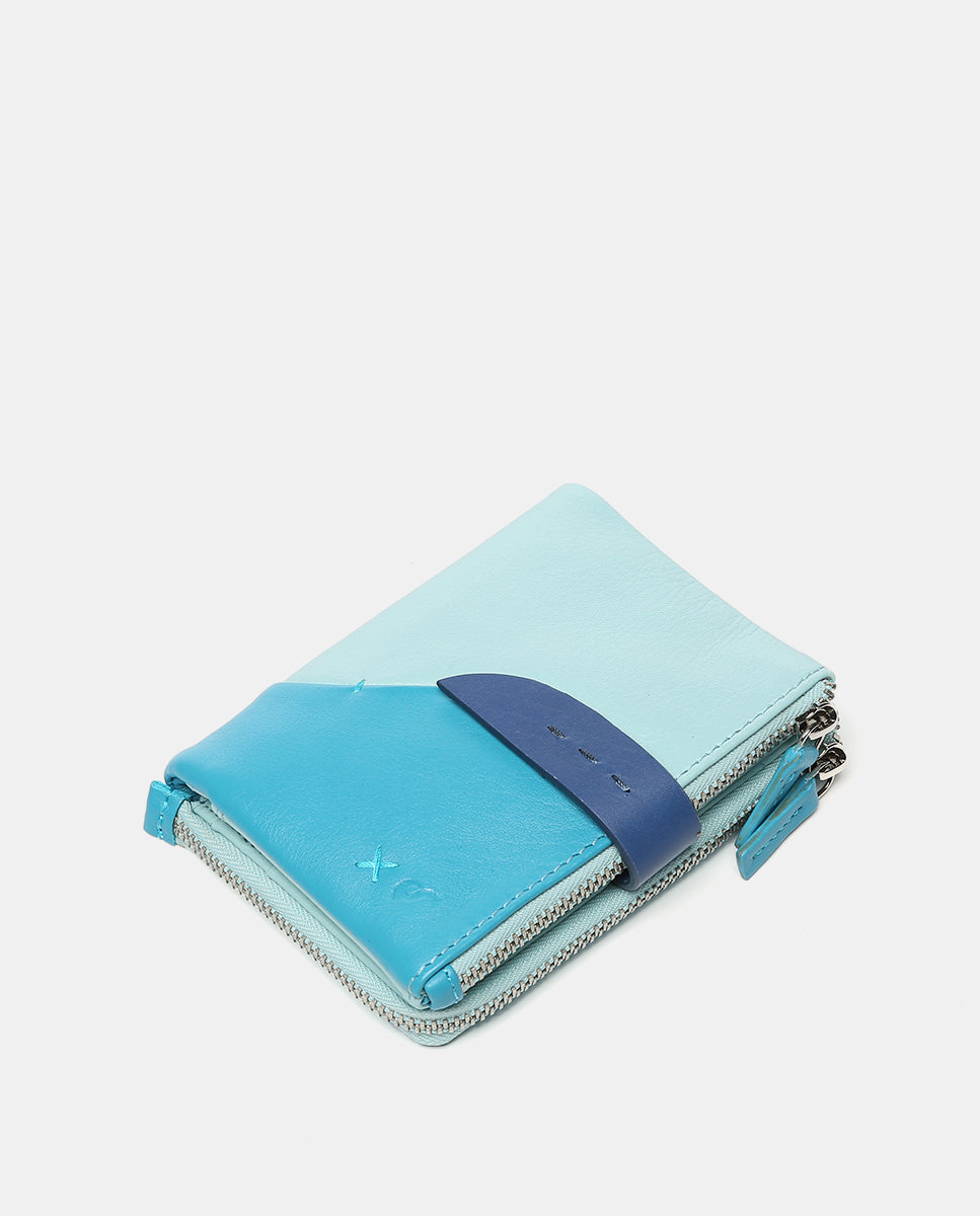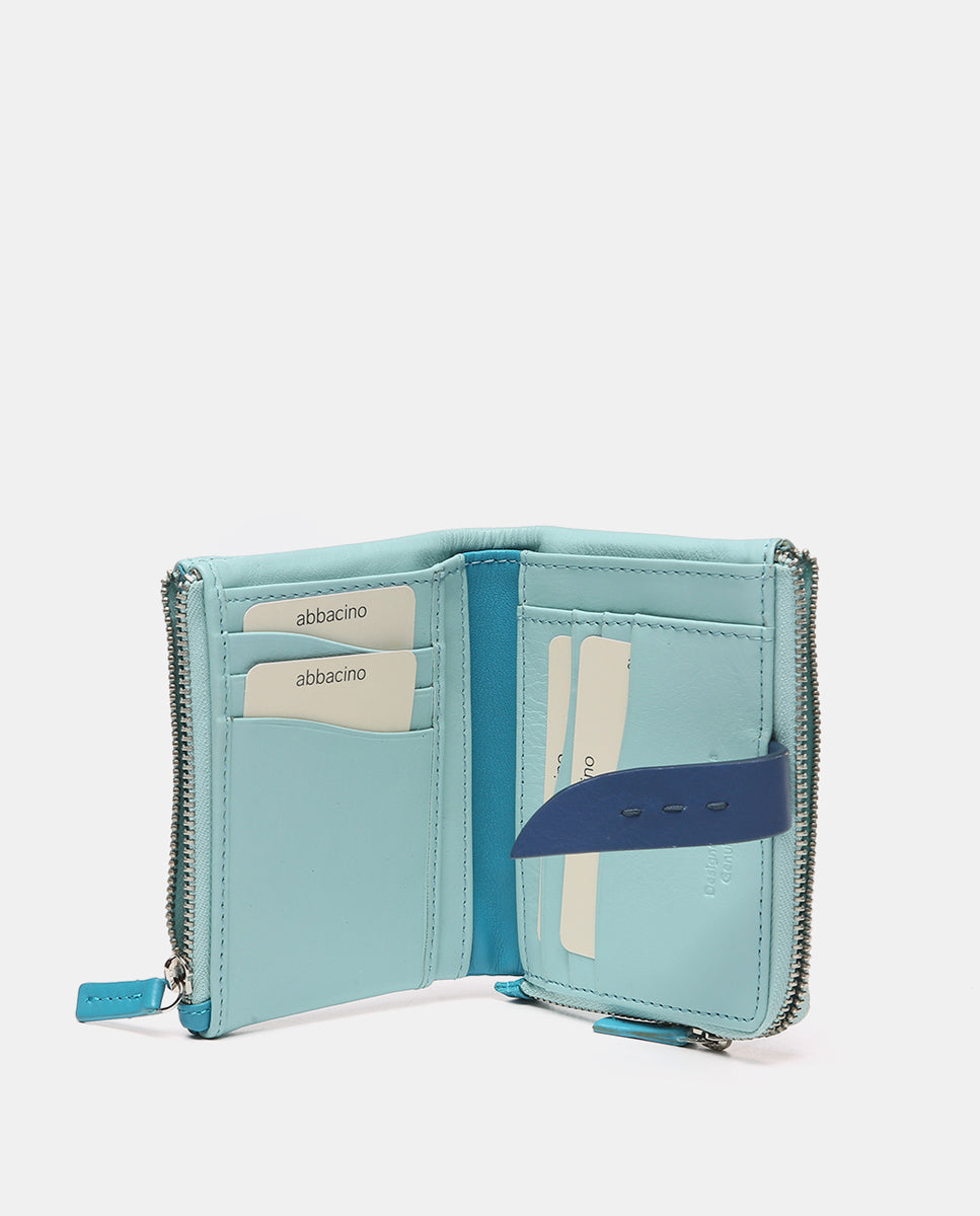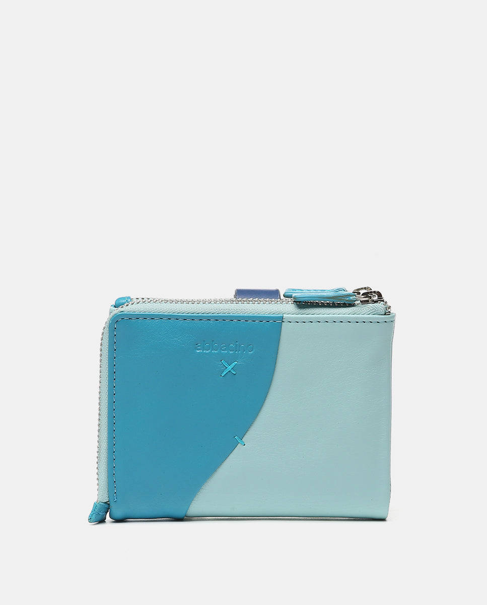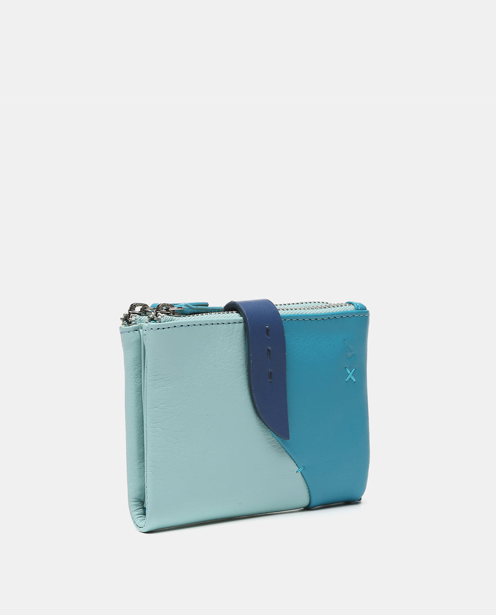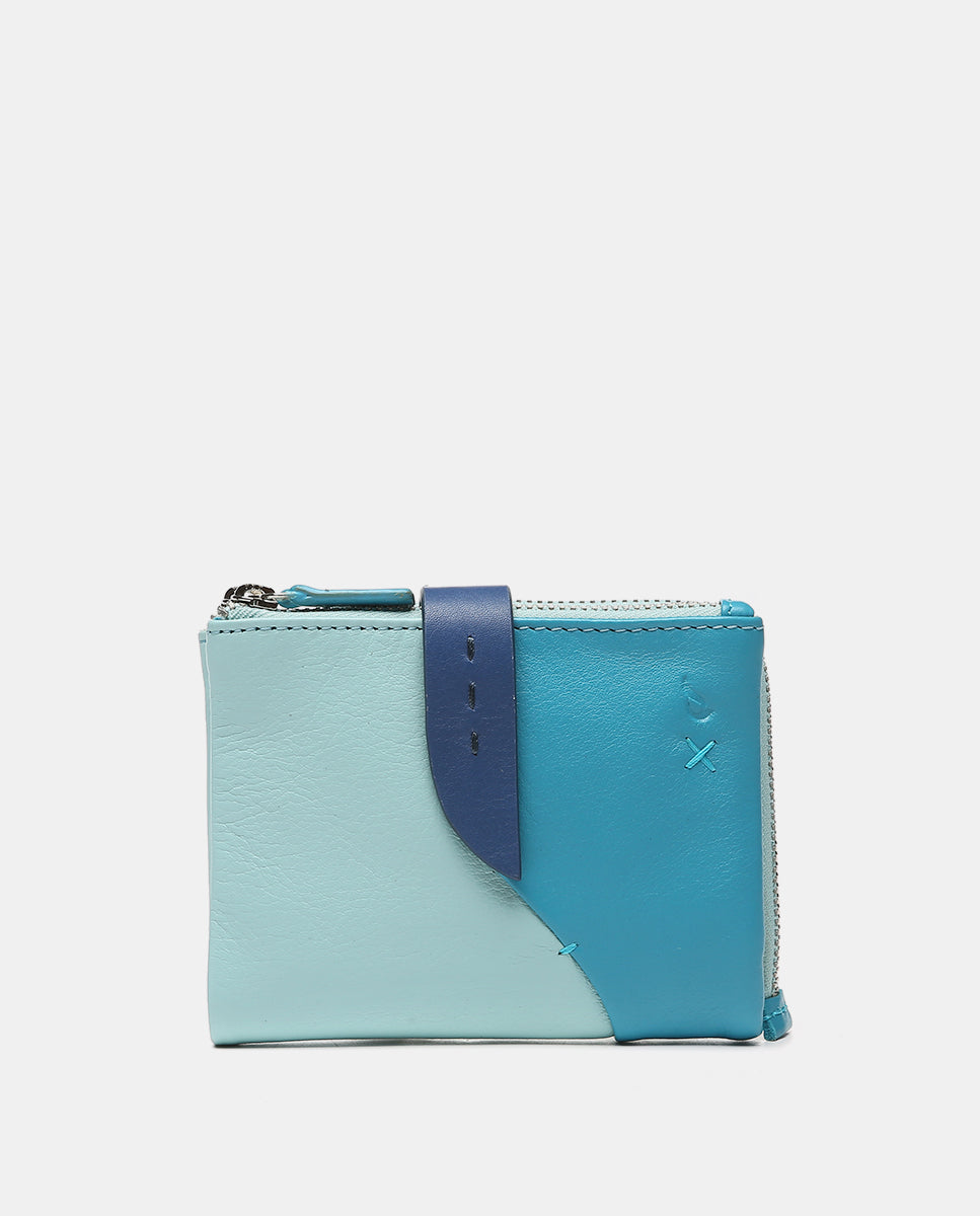 Small women’s wallet made from leather that combines various color tones. A model where a curved strip of darker leather crosses the front of the wallet, adding a touch of contrast and originality to the design. Its main features are: