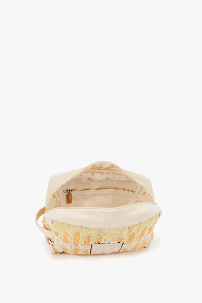 Women’s cosmetic bag made from cotton. A loose-fitting design perfect for carrying your mobile phone, keys, suntan lotion… Ideal for beach days thanks to its colourful print and summery tones. Top zip closure. Hand strap included.